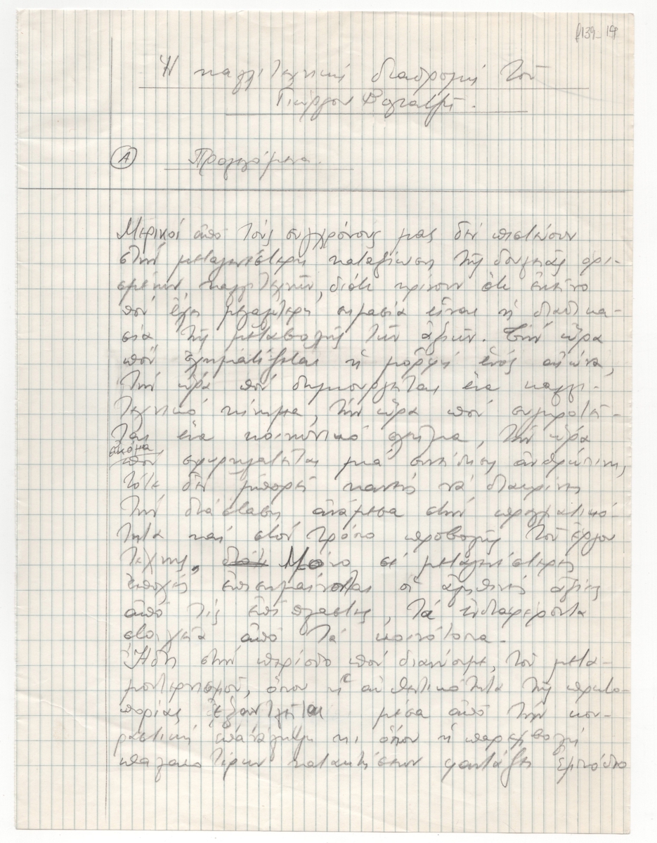 Κείμενο, χειρόγραφο, με μολύβι, χαρτί, 7 φφ, 28,5×21,5 εκ., στα ελληνικά. Το κείμενο δομείται σε: Α. Προλεγόμενα και Β. Ο ρόλος του εξπρεσιονισμού στη νεώτερη ελληνική ζωγραφική