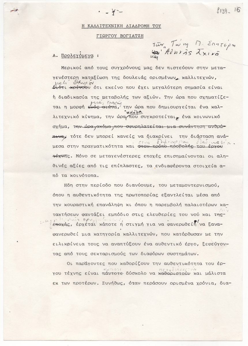 Κείμενο, δακτυλόγραφο, με χειρόγραφες διορθώσεις, στα ελληνικά, χαρτί, 13 φφ, 29,7×21,0 εκ.