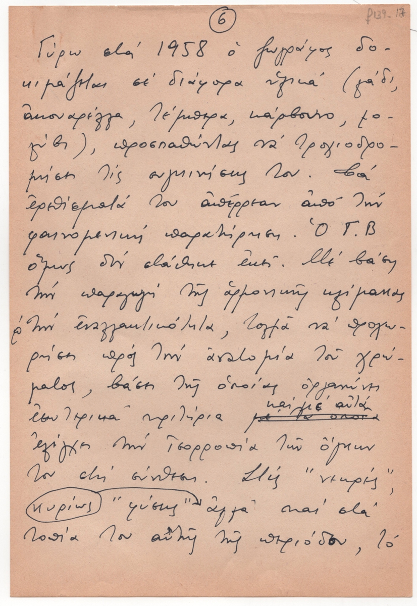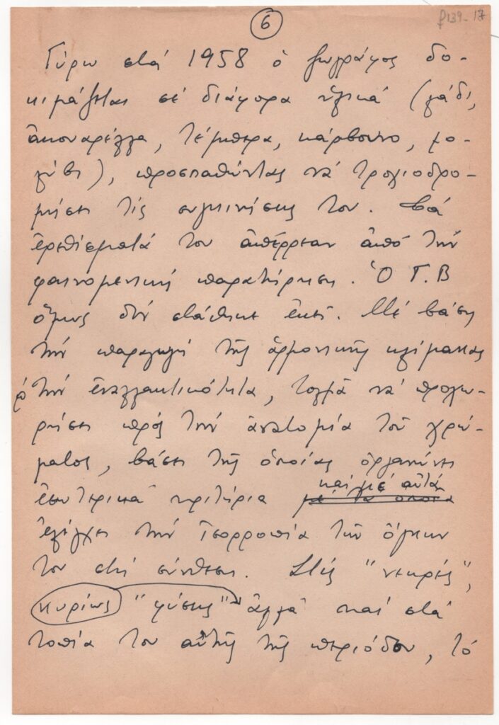 Κείμενο, χειρόγραφο, με μπλε μελάνι, στα ελληνικά, σε χαρτί, 25,0×17,0εκ. Τμήμα κειμένου για την πορεία του καλλιτέχνη από το 1958 κ.ε.