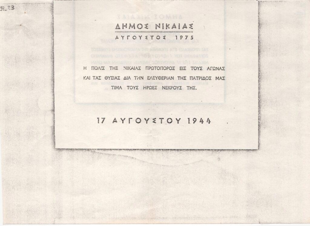 Φωτοαντίγραφο εντύπου, χαρτί, 21,0×29,7 εκ. (διαστάσεις πρωτότυπου εντύπου: 14,0×19,2 εκ.), στα ελληνικά. Ενημερωτικό έντυπο για τις εκδηλώσεις που διοργανώνει ο δήμος Νίκαιας για να τιμήσεις την επέτειο της 17ης Αυγούστου 1944.