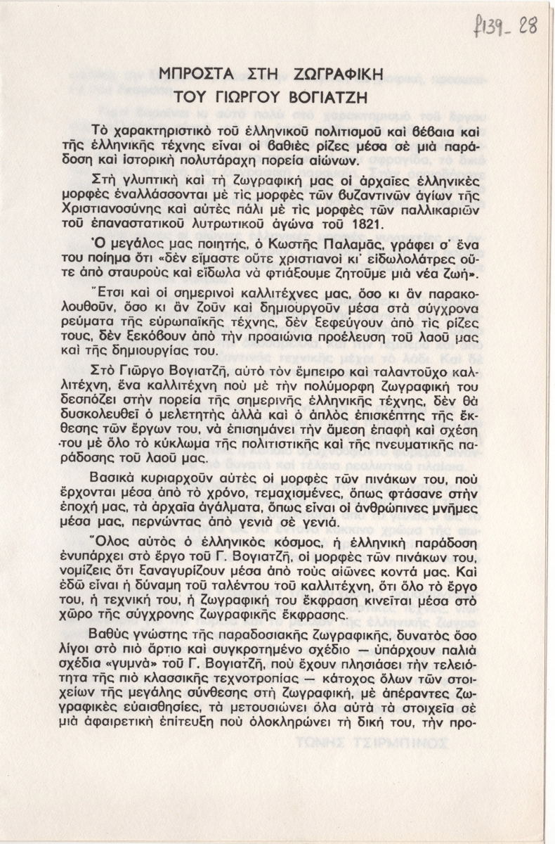 Έντυπο, δίπτυχο, από χαρτί, 21,8×14,5 εκ., στα ελληνικά. Κείμενο του τεχνοκρίτη Τ. Τσιρμπίνου για τον καλλιτέχνη. Πιθανόν απόκομμα εντύπου που συνόδευε έκθεση του καλλιτέχνη στην Γενεύη.