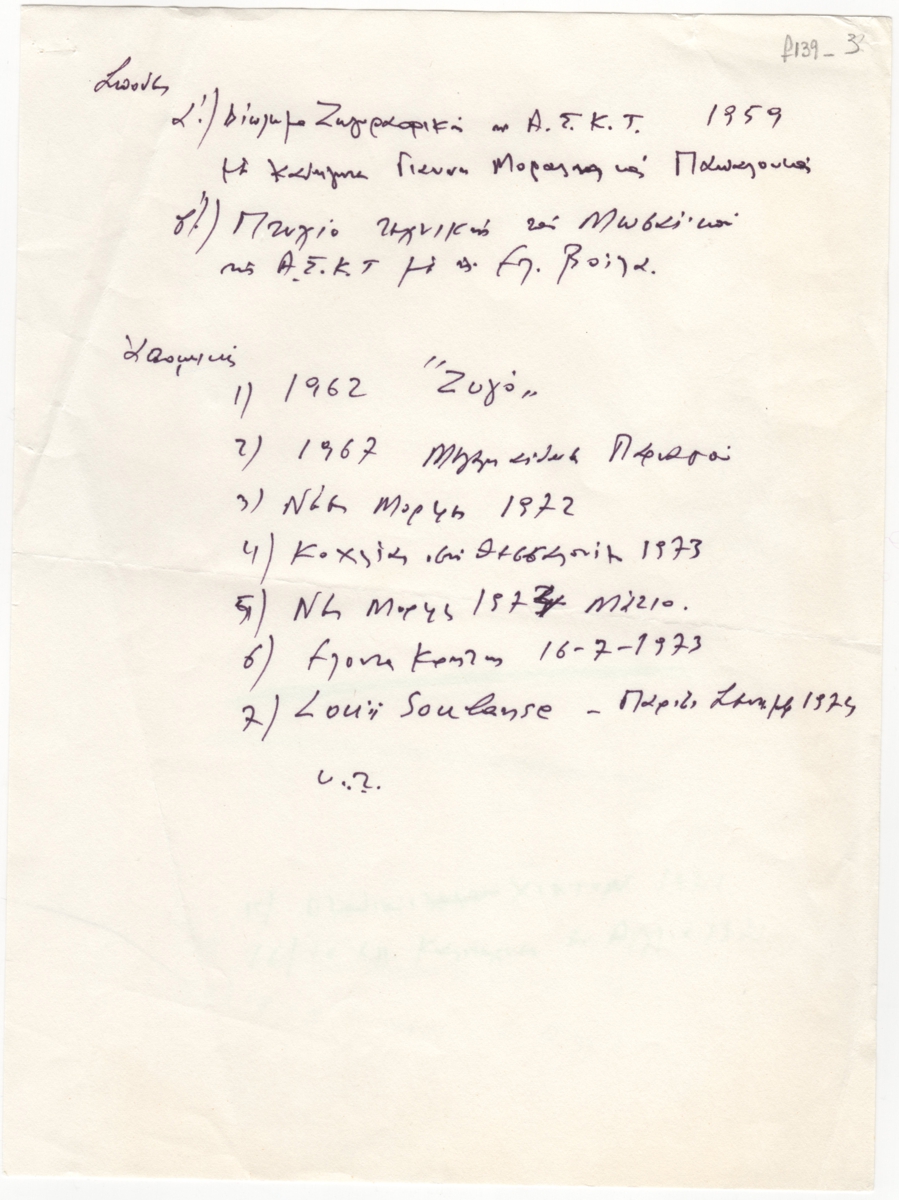 Κείμενο, χειρόγραφο, με μαύρο μελάνι, σε χαρτί, 29,0×21,3 εκ. Περιλαμβάνει σπουδές και ατομικές εκθέσεις.