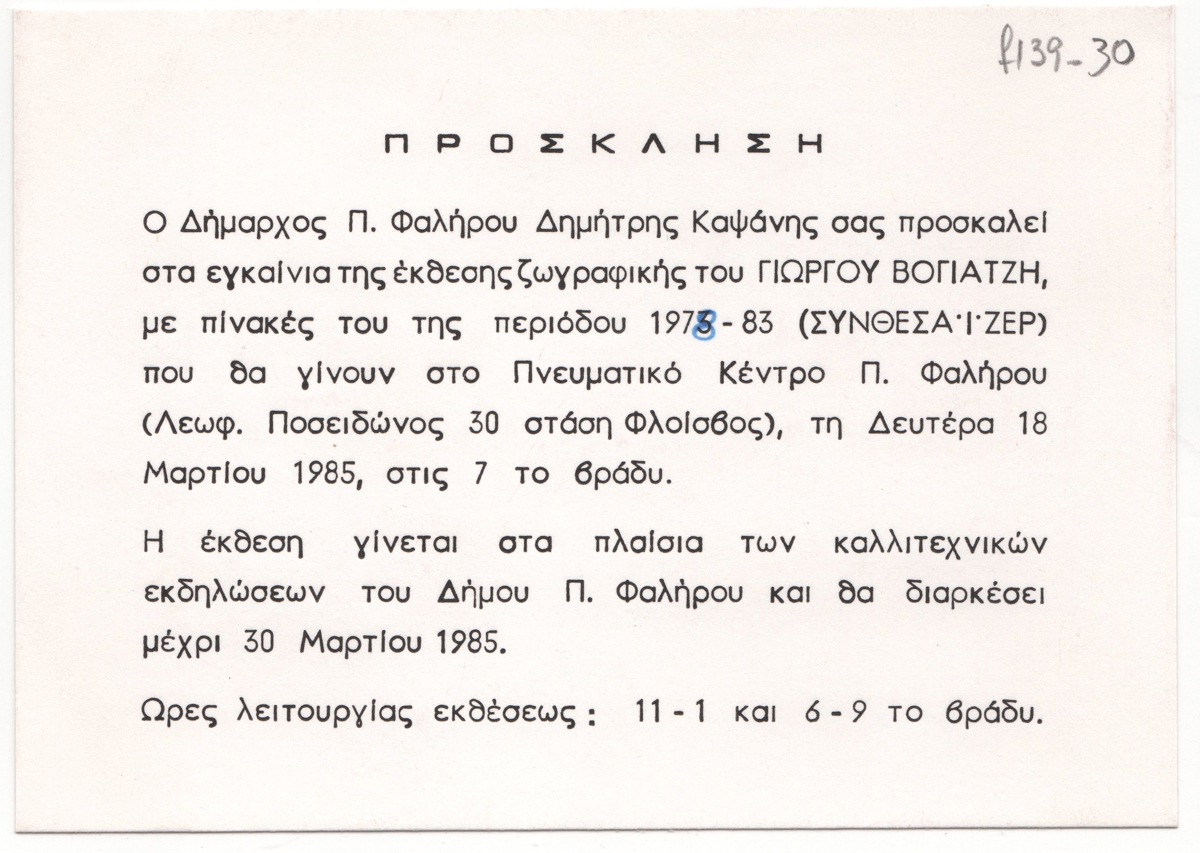 Έντυπο, μονόφυλλο, χαρτόνι, 9,8×14,0 εκ., στα ελληνικά. Πρόσκληση ατομικής έκθεσης του καλλιτέχνη με έργα της περιόδου 1978-1983 (Συνθεσάιζερ) στην Αθήνα το 1985.