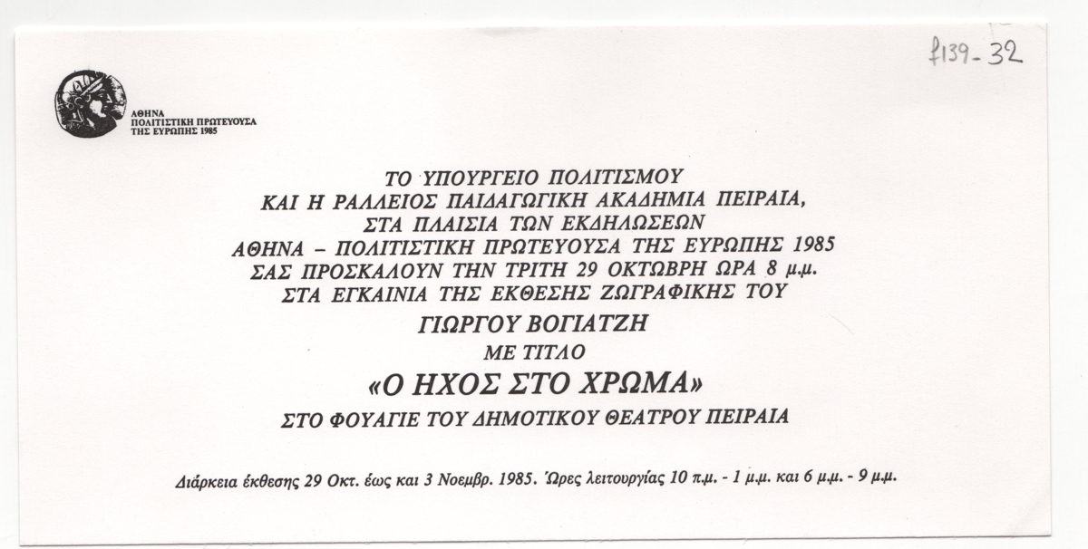 Έντυπο έκθεσης, μονόφυλλο, χαρτόνι, 10,0×19,8 εκ., στα ελληνικά. Αφορά στην ατομική έκθεση του καλλιτέχνη που διοργανώνεται από το Υπουργείο Πολιτισμούς και τη Ράλλειο Παιδαγωγική Ακαδημία Πειραιά στα πλαίσια των εκδηλώσεων “Αθήνα-Πολιτιστική Πρωτεύουσα της Ευρώπης 1985”