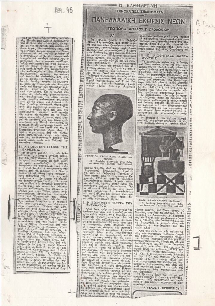 Φωτοαντίγραφο αποκομμάτων εφημερίδας, χαρτί, 29,6×21,0 εκ. (διαστάσεις πρωτότυπου 28,6×11,0 και 23,0×5,5 εκ.), στα ελληνικά. Κριτική του Α. Προκοπίου για την διοργάνωση και τα έργα που βραβεύτηκαν. Εικονογραφείται με αναπαραγωγές έργων.