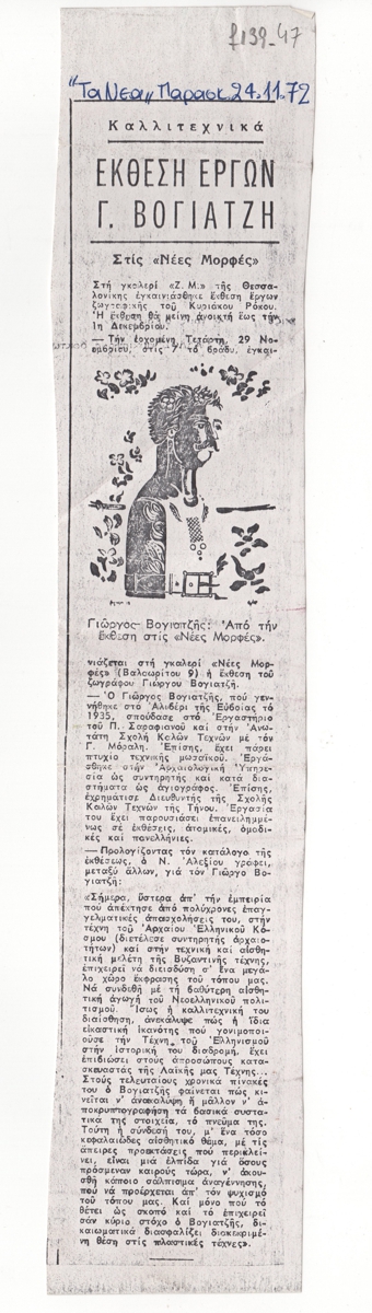 Φωτοαντίγραφο αποκόμματος εφημερίδας, χαρτί, 29,6×5,5 εκ., στα ελληνικά. Κριτική έκθεσης έργων του καλλιτέχνη στην Γκαλερί “Νέες Μορφές” στην Αθήνα, περιλαμβάνεται απόσπασμα από τον πρόλογο του καταλόγου της έκθεσης του Ν. Αλεξίου. Αναφέρεται επίσης η έκθεση του Κυριάκου Ρόκου στην Θεσσαλονίκη. Εικονογραφείται με αναπαραγωγή έργου. Στην κορυφή του αποκόμματος επιγραφή.