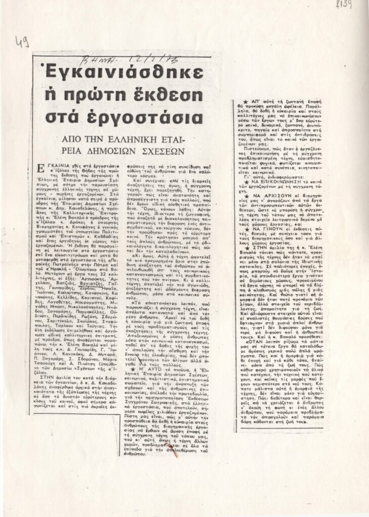 Φωτοαντίγραφο αποκόμματος εφημερίδας, χαρτί, 29,7×21,0 εκ. (διαστάσεις πρωτότυπων: 22,5×10,0και 18,6×5,0 εκ.), στα ελληνικά. Δημοσίευμα για τα εγκαίνια ομαδικής έκθεσης ελληνών καλλιτεχνών στο εργοστάσιο “Ιζόλα” της Θήβας, στα πλαίσια σειράς εκθέσεων που οργανώνει η Ελληνική Εταιρία Δημοσίων Σχέσεων, με στόσο την παρουσίαση σύγχρονης ελληνικής τέχνης σε χώρους-πυρήνες εργαζομένων.