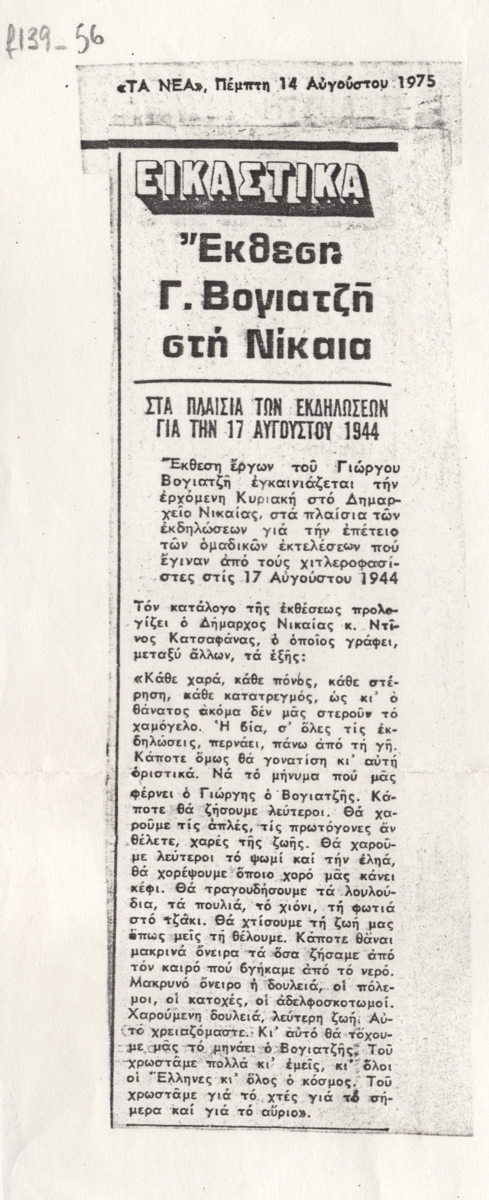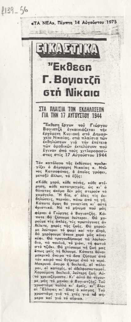 Φωτοαντίγραφο αποκόμματος εφημερίδας, χαρτί, 18,5×6,2 εκ. Δημοσίευμα που αφορά την έκθεση του Γ. Βογιατζή στη Νίκαια στα πλαίσια των εκδηλώσεων για την 17η Αυγούστου 1944.