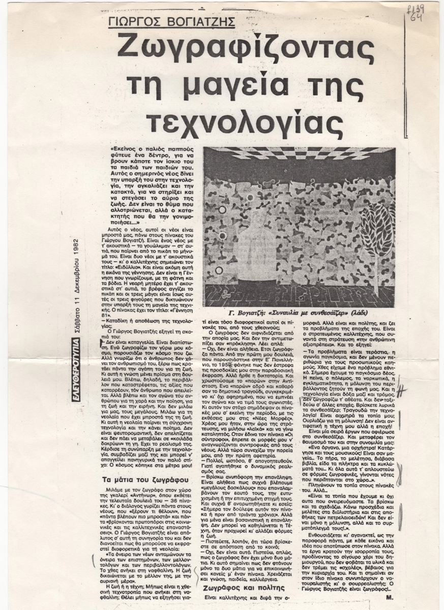 Φωτοαντίγραφο αποκόμματος εφημερίδας, χαρτί, 30,5×21,5 εκ. Συνέντευξη του καλλιτέχνη με αφορμή της ατομική έκθεσή του στην γκαλερί “Αντήνωρ” στην Αθήνα. Εικονογραφείται με αναπαραγωγή έργου.