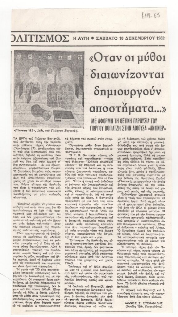 Φωτοαντίγραφο αποκόμματος, έντυπο, χαρτί, 29,7×15,5 εκ., όπου δημοσιεύεται, στα ελληνικά, άρθρο για την ατομική έκθεση του Γ. Βογιατζή στην Αθήνα το 1982. Εικονογραφείται με αναπαραγωγή έργου του καλλιτέχνη.