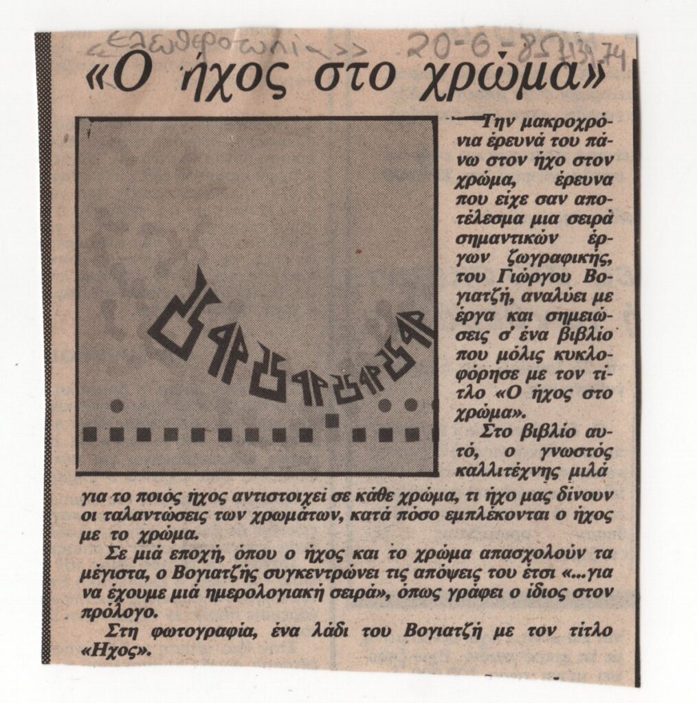 Απόκομμα εφημερίδας, χαρτί, 9,5×8,5 εκ., στα ελληνικά. Το δημοσίευμα αφορά την κυκλοφορία του βιβλίου του καλλιτέχνη “Ο ήχος στο χρώμα”. Εικονογραφείται με αναπαραγωγή έργου. Στην κορυφή του αποκόμματος επιγραφή.
