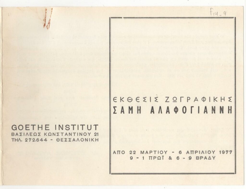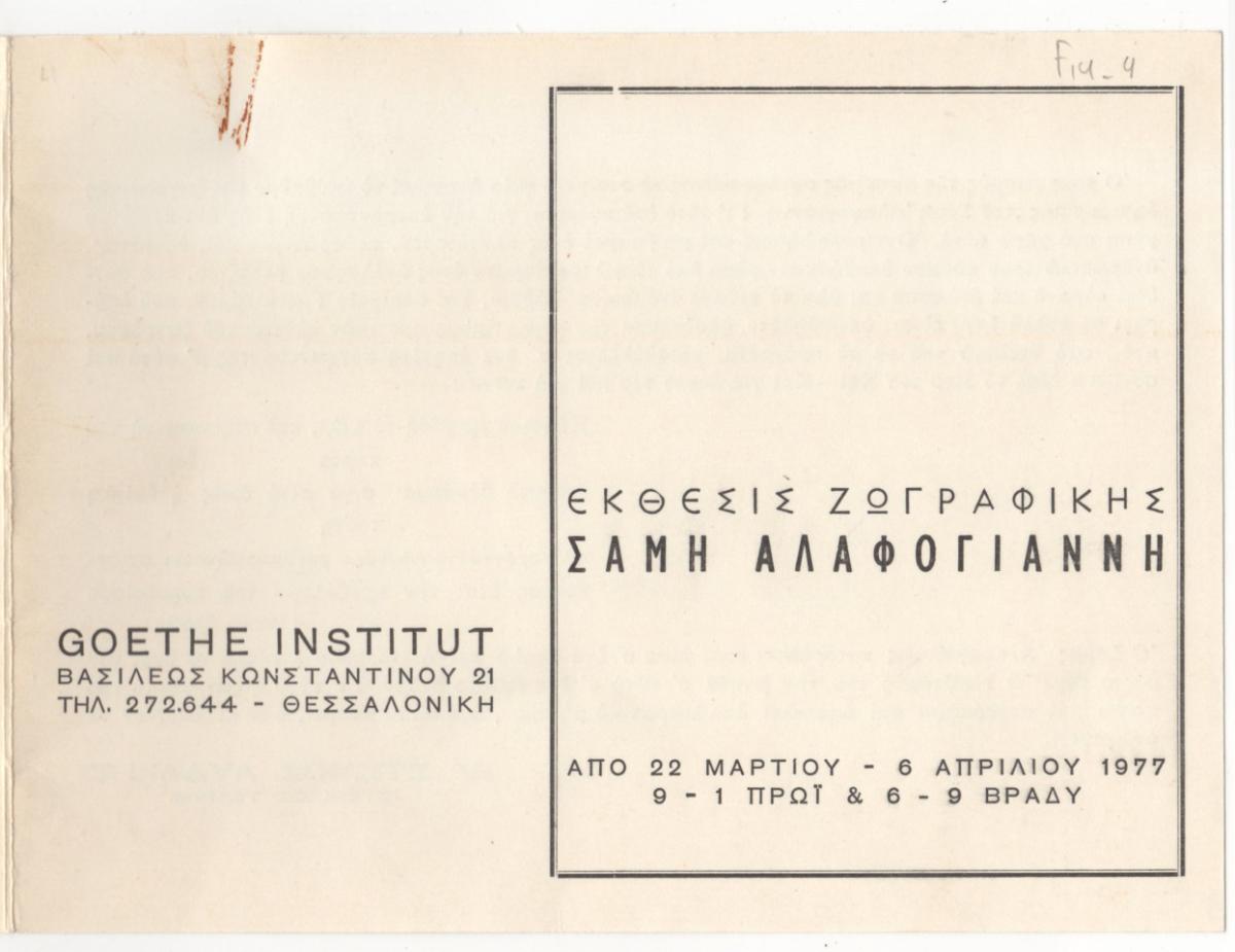 Έντυπο, δίπτυχο, χαρτόνι, 14,5×19,5 εκ., στα ελληνικά. Κατάλογος της ατομικής έκθεσης ζωγραφικής του Σάμη Αλαφογιάννη στην Θεσσαλονίκη το 1977. Περιλαμβάνει αποσπάσματα κριτικών του ιστορικού τέχνης Δρ. Στέλιου Λυδάκη, της ιστορικού τέχνης Ελένης Βακαλό και του εκτιμητή έργων τέχνης Διομήδη Διαλυνά καθώς και κατάλογο εκθέσεων και δημοσιευμάτων.