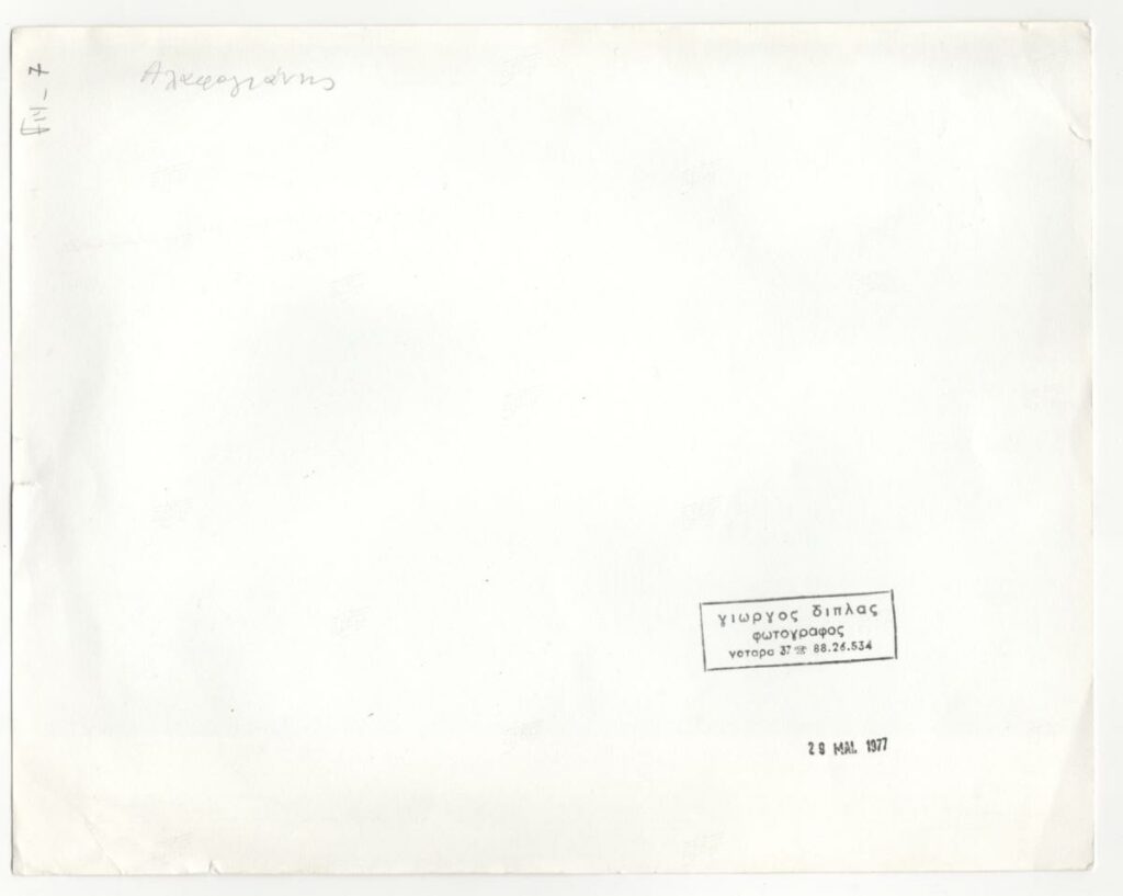 Φωτογραφία, α/μ, σε φωτογραφικό χαρτί, 20,2×25,7 εκ. Αναπαραγωγή έργου του Σάμη Αλαφογιάννη Στην πίσω όψη επιγραφή, σφραγίδα του φωτογράφου Γιώργου Δίπλα και σφραγίδα ημερομηνίας εμφάνισης.