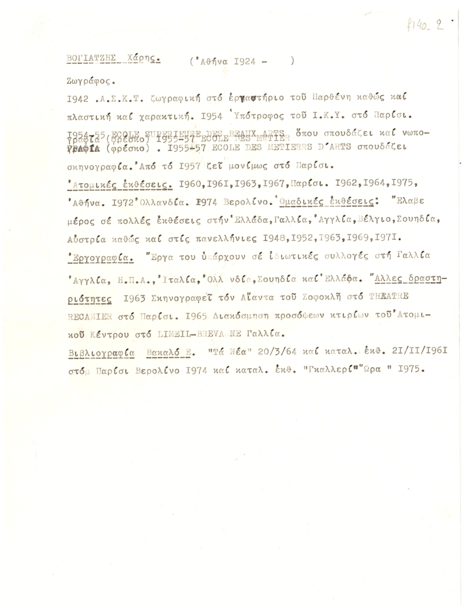 Βιογραφικό, δακτυλόγραφο, χαρτί, 29×21 εκ., στα ελληνικά, του Χάρη Βογιατζή. Περιέχει προσωπικά στοιχεία, ατομικές και ομαδικές εκθέσεις, εργογραφία και δραστηριότητες του καλλιτέχνη καθώς και βιβλιογραφία γι’ αυτόν.