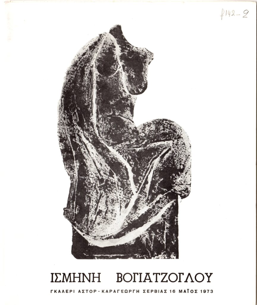 Έντυπο, χαρτόνι τρίπτυχο, 22×17,5 εκ., στα ελληνικά με παράλληλη μετάφραση στα αγγλικά, ατομικής έκθεσης της Ισμήνης Βογιατζόγλου, η οποία διεξάγεται στην Γκαλερί Άστορ στην Αθήνα. περιέχει κείμενο του κριτικού Στέλιου Λυδάκη και βιογραφικό σημείωμα.