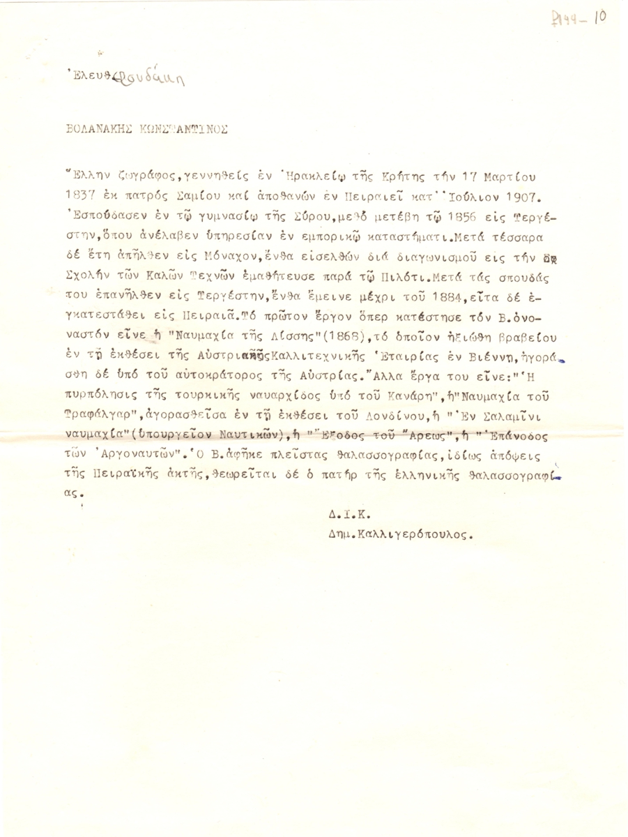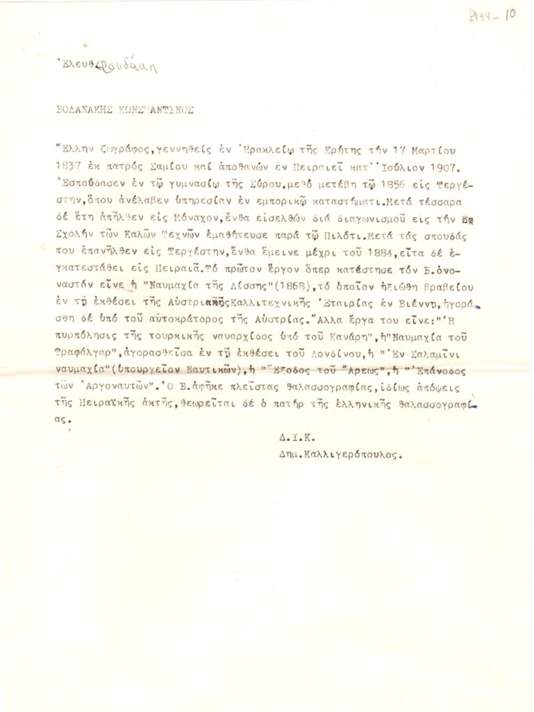 Κείμενο, δακτυλόγραφο, χαρτί, μία όψη, 29×21 εκ., στα ελληνικά. Αποδελτίωση λήμματος εγκυκλοπαίδειας για τον Βολανάκη Κωνσταντίνο. Στο πάνω τμήμα υπάρχουν επιγραφές.