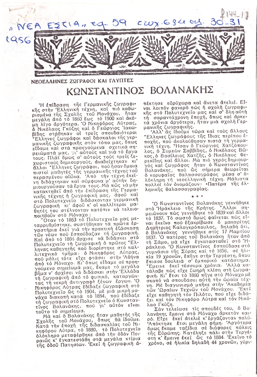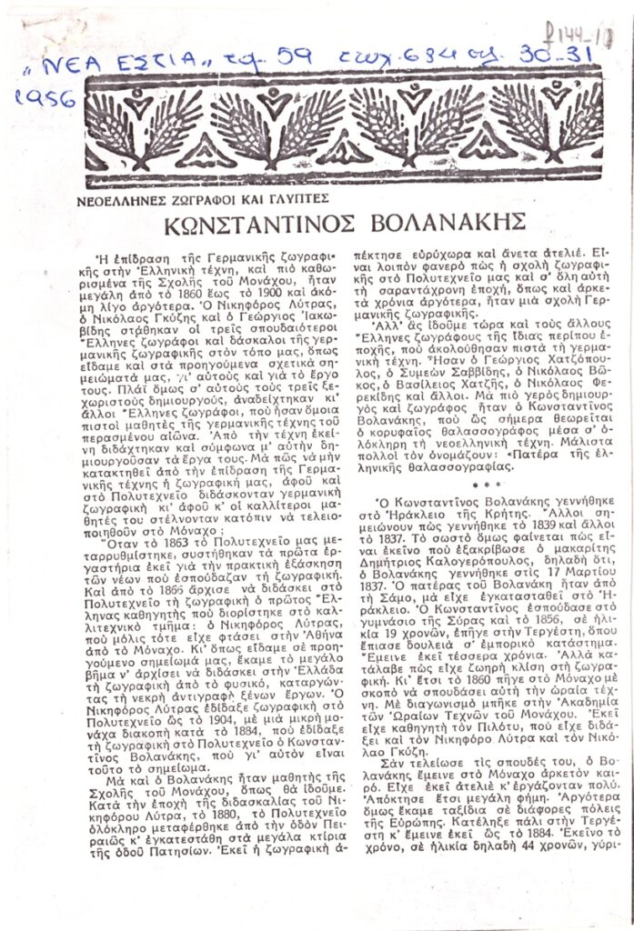 Φωτοαντίγραφο, χαρτί, 2 φ. μίας όψης, 17×11,5 εκ., στα ελληνικά, δημοσίευσης κειμένου για τον Κωνσταντίνο Βολανάκη. Εντάσσεται στη στήλη “Νεοέλληνες ζωγράφοι και γλύπτες” του εντύπου.