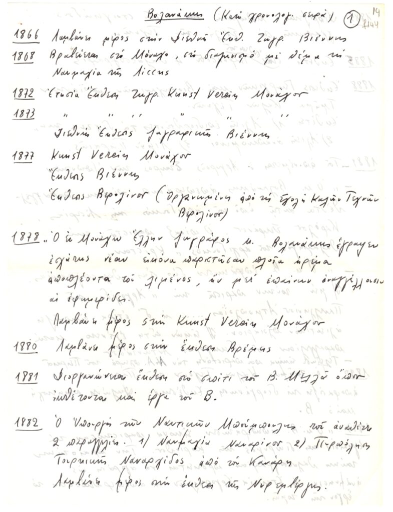 Χειρόγραφο, χαρτί, 2 φφ, 28,5×21 εκ., στα ελληνικά, με λίστα εκθέσεων στις οποίες συμμετείχε ο Κωνσταντίνος Βολανάκης με χρονολογική σειρά. Στο τέλος του κειμένου υπάρχει κριτική στο περιοδικό “Παναθήναια” για τον καλλιτέχνη.