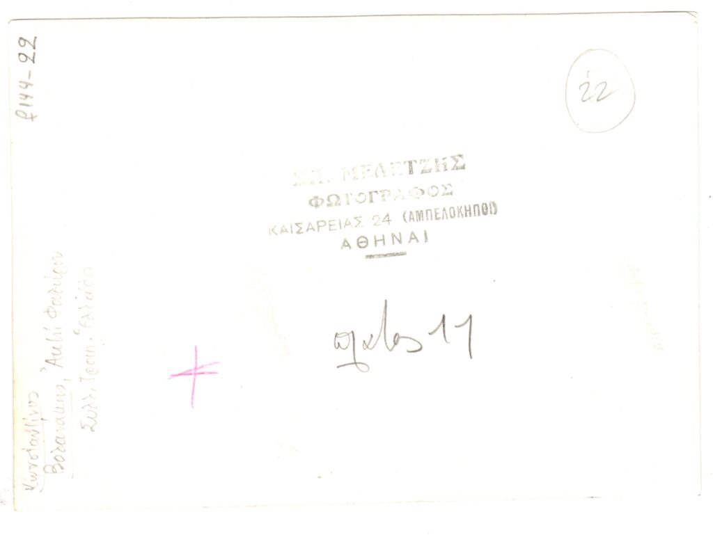 Φωτογραφία, α/μ, φωτογραφικό χαρτί, 10,5×15 εκ., έργου του Κωνσταντίνου Βολανάκη. Η πίσω όψη φέρει επιγραφές, στα ελληνικά και σφραγίδα του φωτογράφου Σπύρου Μελετζή.