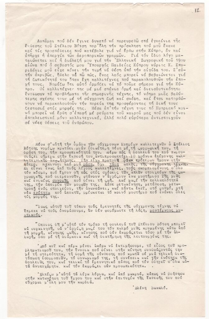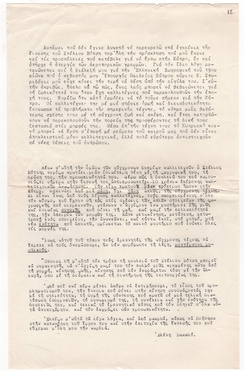 Κείμενο, δακτυλόγραφο, χαρτί, 33,0×21,0 εκ., στα ελληνικά. Κείμενο (ομιλία;) της Ε. Βακαλό για τα εγκαίνια έκθεσης του καλλιτέχνη στην Κύπρο.