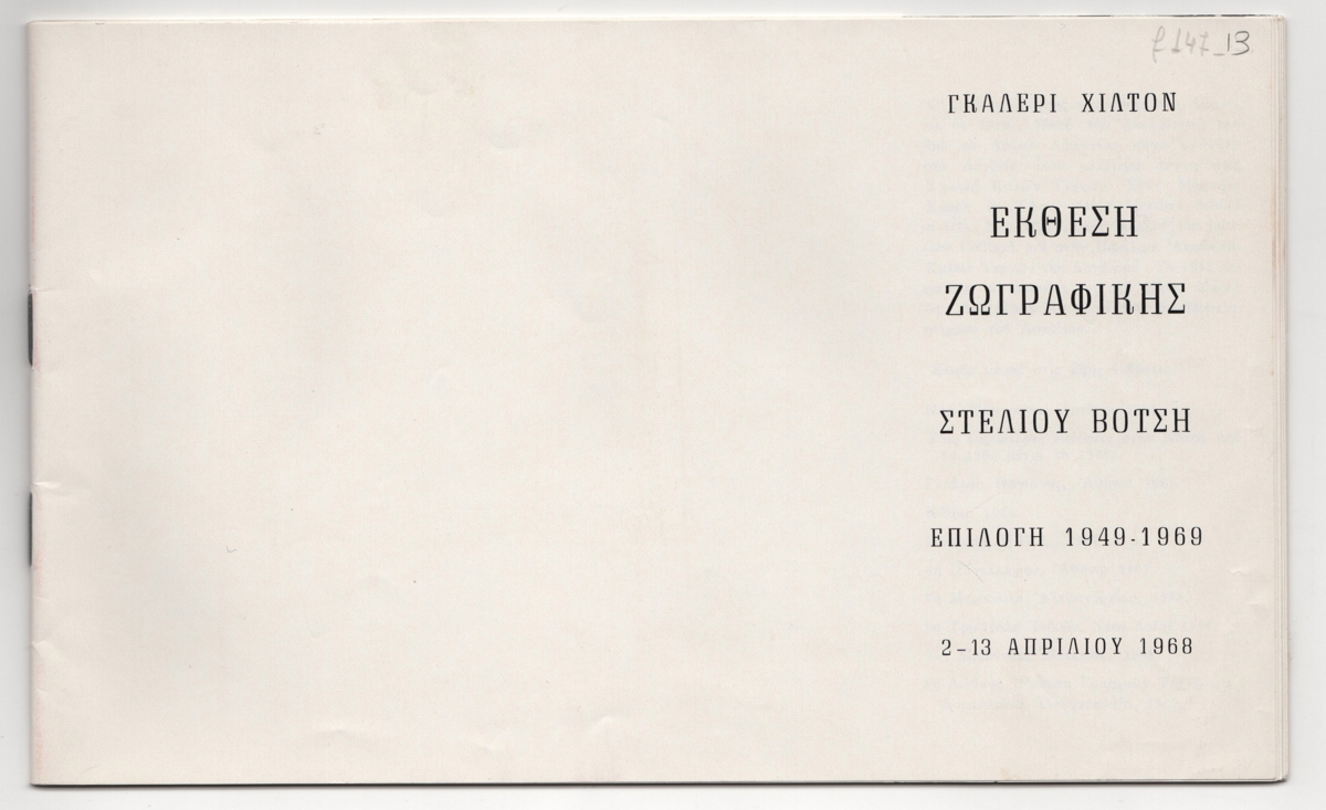 Έντυπο έκθεσης, χαρτί ιλουστρασιόν, 16 φφ, 14,0×23,0 εκ., στα ελληνικά, αγγλικά, γαλλικά. Περιέχει σύντομο βιογραφικό καλλιτέχνη, κείμενο του Τώνη Σπητέρη από τον κατάλογο της 24ης Biennale di Venezia (1968). Εικονογραφείται με αναπαραγωγές έργων.