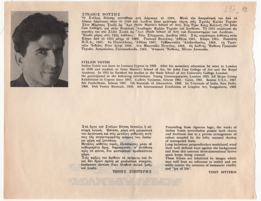 Απόκομμα εντύπου έκθεσης(;), χαρτί, 17,3×22,0 εκ., στα ελληνικά και αγγλικά. Περιέχει επίσης απόσπασμα κειμένου του Τώνη Σπητέρη για τον καλλιτέχνη. Εικονογραφείται με αναπαραγωγή φωτογραφίας του καλλιτέχνη