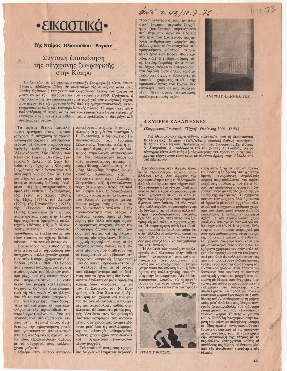 Απόκομμα περιοδικού, χαρτί, 28,0×21,0 εκ. Άρθρο της Ντ. Ηλιοπούλου-Ρογκάν για την κυπριακή ζωγραφική με αφορμή νην έκθεση τεσσάρων Κυπρίων καλλιτεχνών στη Θεσσαλονίκη”. Εικονογραφείται με αναπαραγωγές έργων. Στην κορυφή της σελίδας επιγραφή.