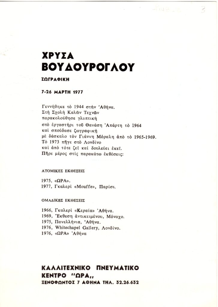 Έντυπο, χαρτί ιλουστρασιόν διπλής όψεως, 24,5×17,5 εκ., στα ελληνικά, ατομικής έκθεσης ζωγραφικής της Χρύσας Βουδούρογλου, η οποία διεξάγεται στο Καλλιτεχνικό Πνευματικό Κέντρο ‘Ώρα, στην Αθήνα, το 1977. Το έντυπο εικονογραφείται, ενώ αναγράφεται σε αυτό βιογραφικό της καλλιτέχνιδας με λίστα ατομικών και ομαδικών εκθέσεών της.