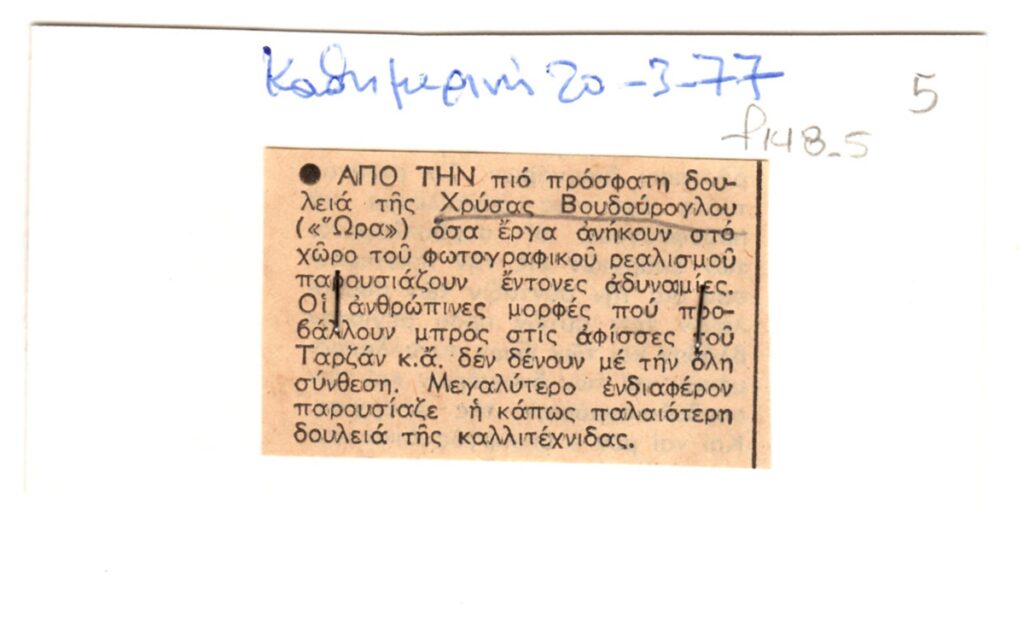 Απόκομμα, χαρτί, συρραμμένο σε απόκομμα πρόσκλησης, συνολικών διαστάσεων 5×10 εκ., στα ελληνικά, δημοσίευσης κριτικής ατομικής έκθεσης της Χρύσας Βουδούρογλου, η οποία διεξάγεται στο Καλλιτεχνικό Πνευματικό Κέντρο Ώρα στην Αθήνα.