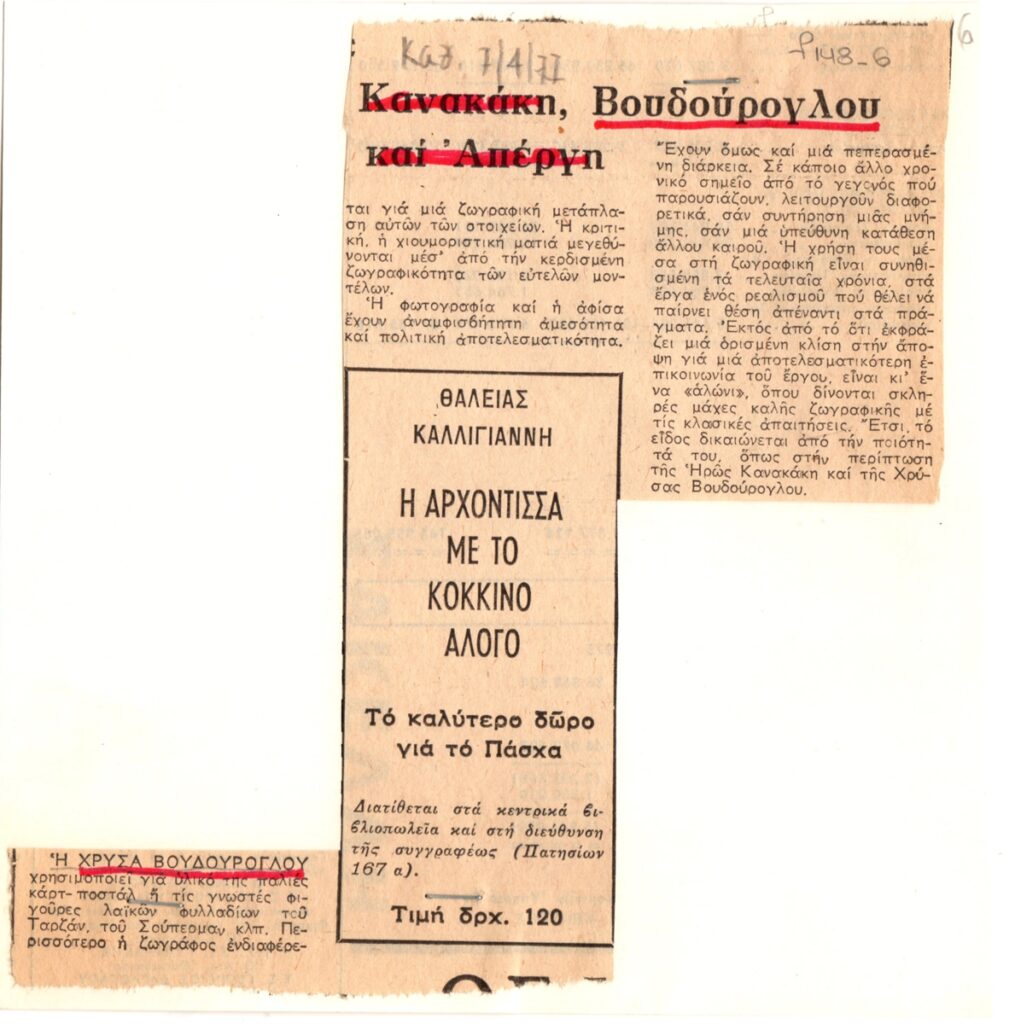 Απόκομμα, χαρτί, ακανόνιστου σχήματος, συρραμμένο σε απόκομμα πρόσκλησης εγκαινίων έκθεσης, συνολικών διαστάσεων 16.5×16 εκ., στα ελληνικά, δημοσίευσης κριτικής ατομικής έκθεσης της Χρύσας Βουδούρογλου, η οποία διεξάγεται στο Καλλιτεχνικό Πνευματικό Κέντρο Ώρα στην Αθήνα.