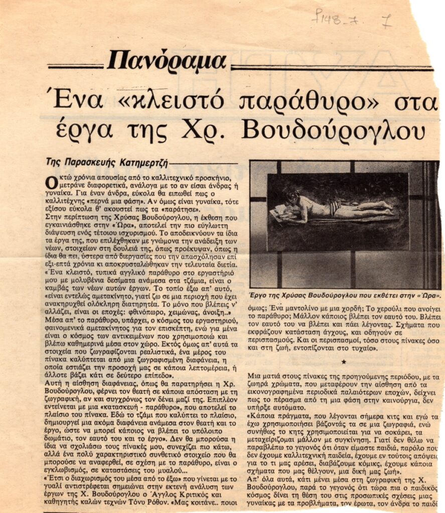 Απόκομμα, χαρτί, 22×19 εκ., στα ελληνικά, δημοσίευσης κριτικής ατομικής έκθεσης ζωγραφικής της Χρύσας Βουδούρογλου στο Καλλιτεχνικό Πνευματικό Κέντρο Ώρα στην Αθήνα.