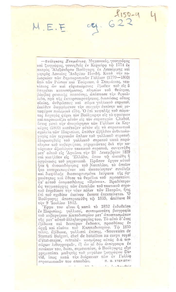 Απόκομμα, χαρτί, κολλημένο σε απόκομμα χαρτιού, συνολικών διαστάσεων 14,5×8 εκ., στα ελληνικά, με βιογραφικό του Σταμάτη Βούλγαρη.