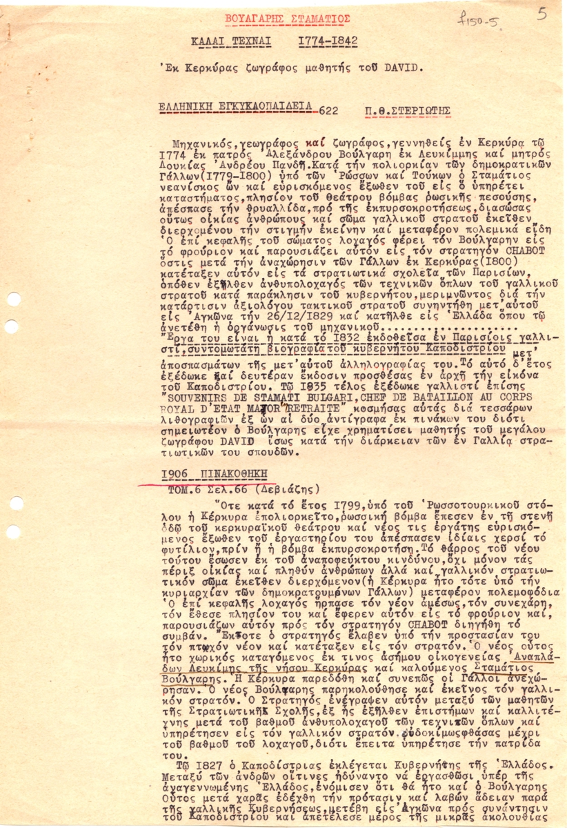 Κείμενο, δακτυλόγραφο, χαρτί, 3 φφ, 32×22,5 εκ., στα ελληνικά, με αποδελτιώσεις πηγών για τον Σταμάτη Βούλγαρη.