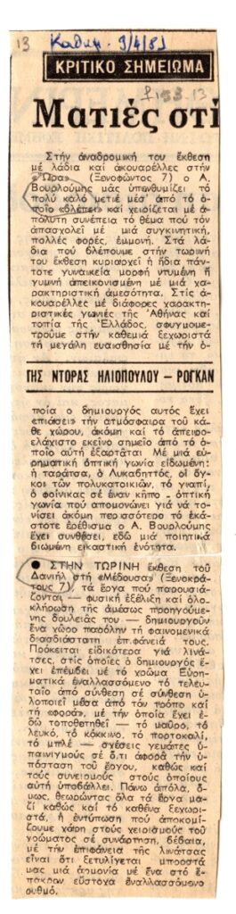 Απόκομμα, χαρτί, 22×5,5 εκ., στα ελληνικά, δημοσίευσης κριτικής έκθεσης του Ανδρέα Βουρλούμη στο Καλλιτεχνικό Πνευματικό Κέντρο Ώρα και του Δανιήλ, στην γκαλερί Μέδουσα, στην Αθήνα, το 1981. Εντάσσεται στην ομώνυμη στήλη του εντύπου “Ματιές στις εκθέσεις-Κριτικό σημείωμα”.