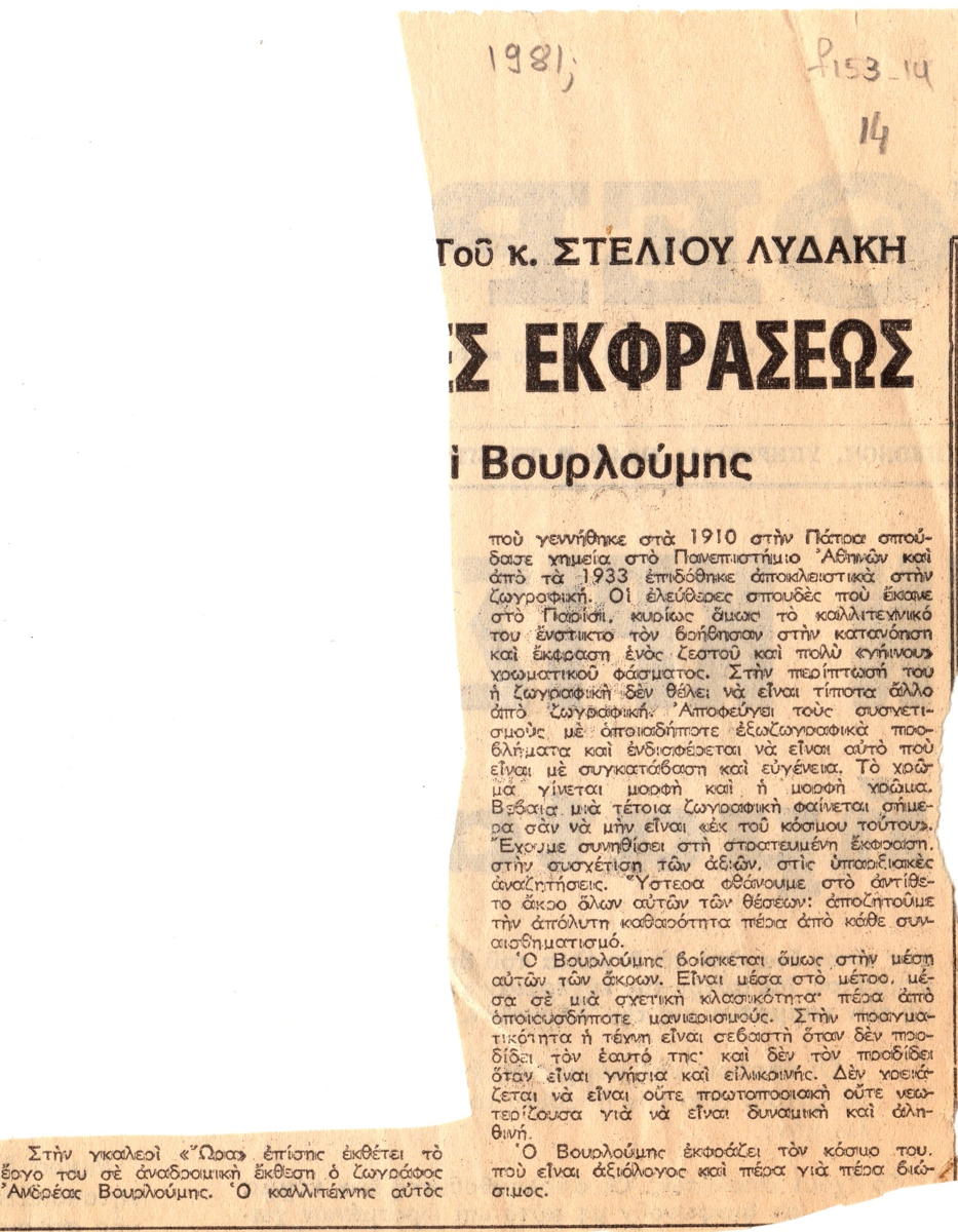 Απόκομμα, χαρτί, 17×14 εκ., στα ελληνικά, δημοσίευσης κριτικής αναδρομικής έκθεσης του Ανδρέα Βουρλούμη στο Καλλιτεχνικό Πνευματικό Κέντρο Ώρα, στην Αθήνα.