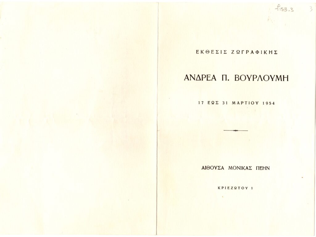 Έντυπο, χαρτί αναδιπλωμένο, 21,5×14,5 εκ., στα ελληνικά, ατομικής έκθεσης ζωγραφικής του Ανδρέα Βουρλούμη. Το έντυπο περιέχει τιμοκατάλογο έργων, με επιγραφές.