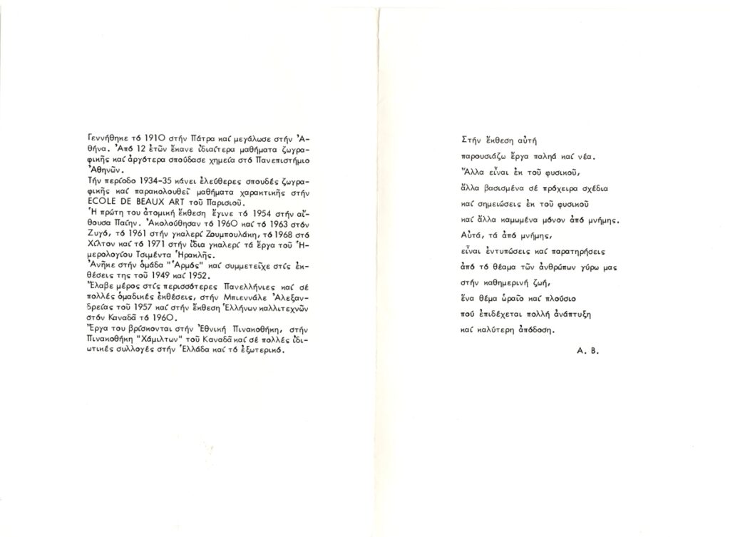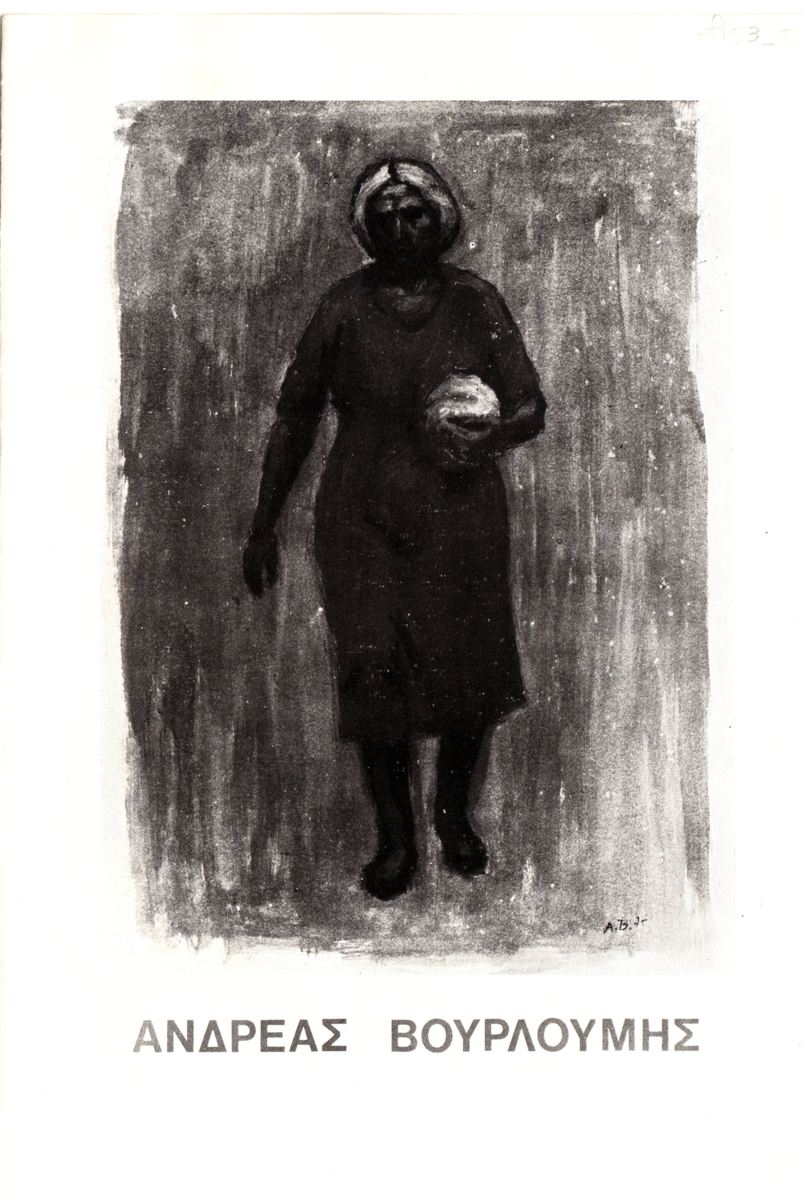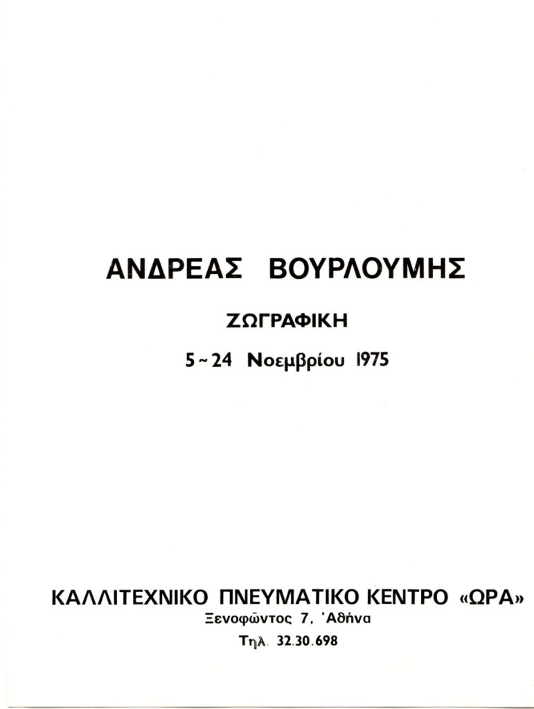 Έντυπο, χαρτί αναδιπλωμένο, 24,2×17,2 εκ., στα ελληνικά, ατομικής έκθεσης ζωγραφικής του Ανδρέα Βουρλούμη στο Καλλιτεχνικό Πνευματικό Κέντρο Ώρα, στην Αθήνα. Το έντυπο περιέχει βιογραφικό του καλλιτέχνη, κείμενό του για την έκθεσή του και εικονογράφηση.