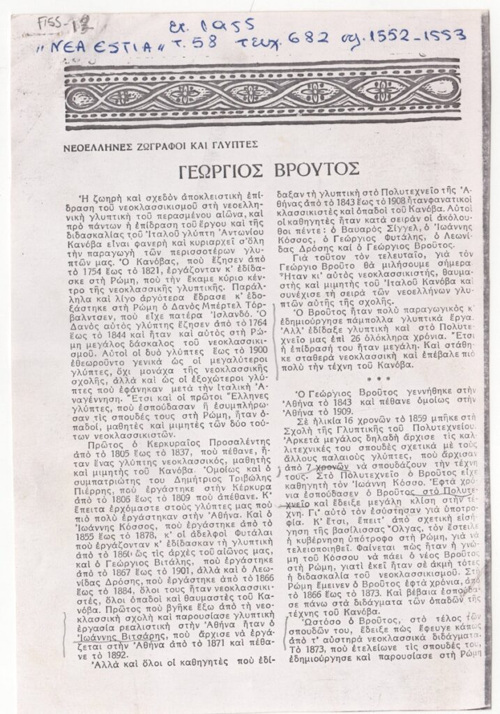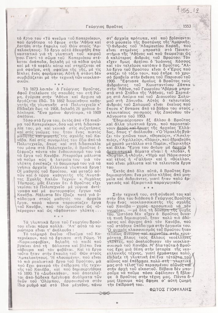Φωτοαντίγραφο αποκόμματος περιοδικού, χαρτί, 2 φφ, 16,7×11,5 εκ., στα ελληνικά. Κείμενο του Φ. Γιοφύλλη για τον καλλιτέχνη και το έργο του στη στήλη “Νεοέλληνες ζωγράφοι και γλύπτες”.