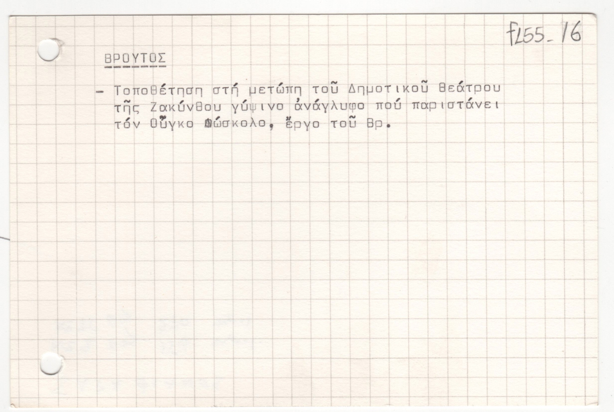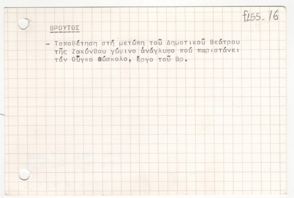 Κείμενο, δακτυλόγραφο, σε κάρτα, χαρτόνι, 10,0×15,0 εκ. Αφορά τοποθέτηση έργου στη μετώπη του Δημοτικού Θεάτρου της Ζακύνθου. Στην πίσω όψη επιγραφή.