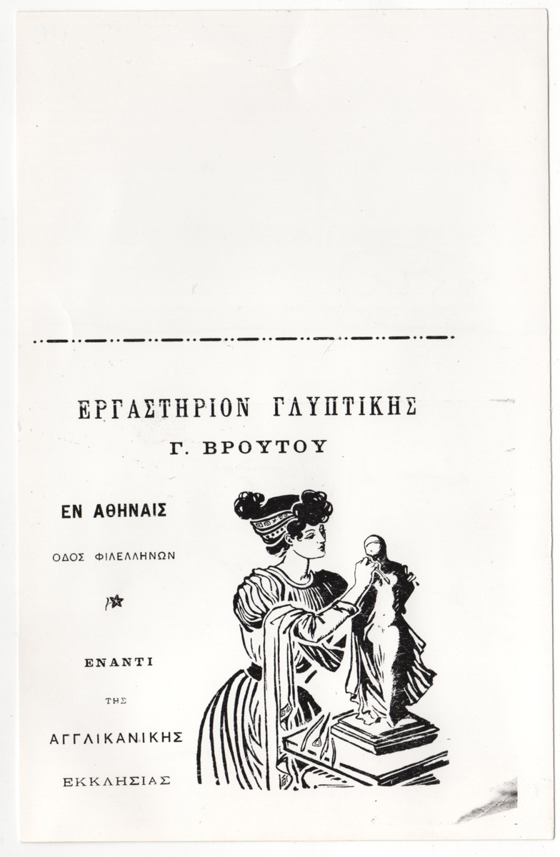 Φωτογραφία διαφημιστικού φυλλάδιου του καλλιτέχνη, 20,2×13,0 εκ. Διαφημίζεται το “Εργαστήριον Γλυπτικής Γ. Βρούτου” στην Αθήνα. Στην πίσω όψη επιγραφή.