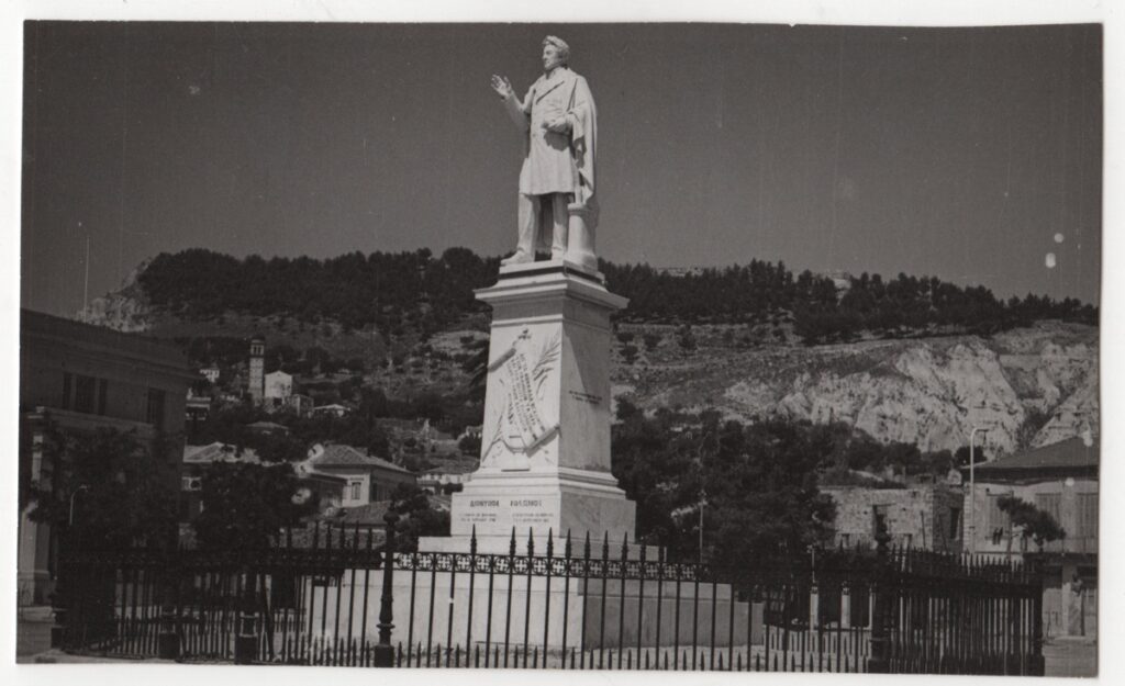 Φωτογραφία έργου, α/μ, εκτυπωμένη ως ταχυδρομική κάρτα, 7,8×13,0 εκ. Στην πίσω όψη επιγραφή. Άγαλμα του Δ. Σολωμού στον χώρο όπου έχει ανεγερθεί.