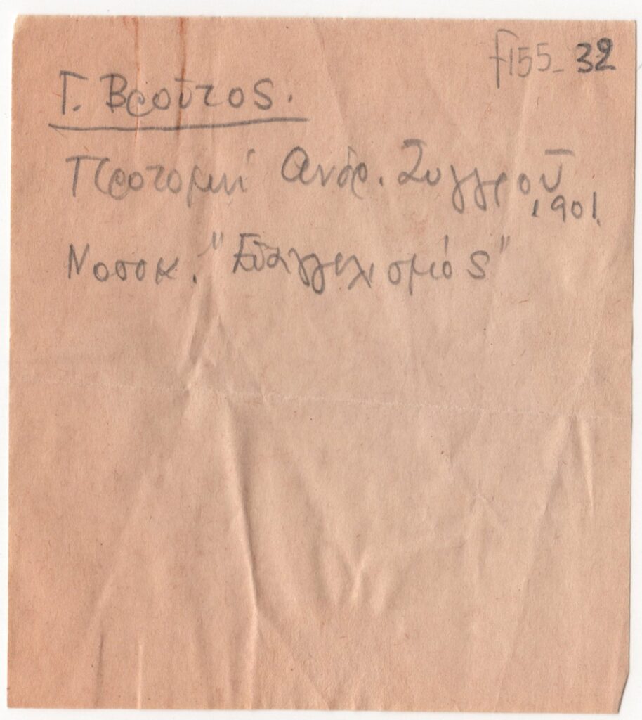 Κείμενο, χειρόγραφο, με μολύβι, στα ελληνικά, σε απόκομμα χαρτιού, 10,2×9,2 εκ.Σημείωση σχετικά με την προτομή του Ανδρέα Συγγρού που βρίσκεται στο Νοσοκ. “Ευαγγελισμός”.