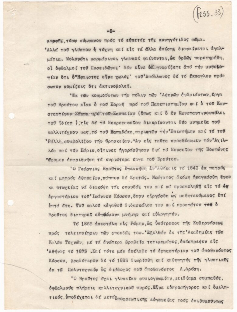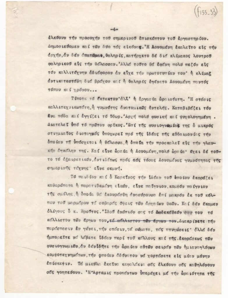 Κείμενο, δακτυλόγραφο, σε χαρτί, 6 φφ, 28,6×21,2 εκ., στα ελληνικά. Δακτυλογραφημένο άρθρο του Γρ. Ξενόπουλου για τον καλλιτέχνη, που δημοσιεύτηκε στο περιοδικό ΕΣΤΙΑ. Στην πρώτη σελίδα, αριστερά από το κείμενο, επιγραφή.