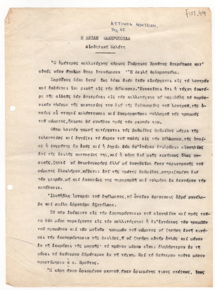 Κείμενο, δακτυλόγραφο με χειρόγραφες συμπληρώσεις, χαρτί, 5 φφ, 29,4×21,2 εκ. Αποδελτίωση ή αντιγραφή άρθρου του Ι. Πολέμη στο περιοδικό “Αττικόν Μουσείον”. Αποτελεί κριτική του νέου αγάλματος του καλλιτέχνη.