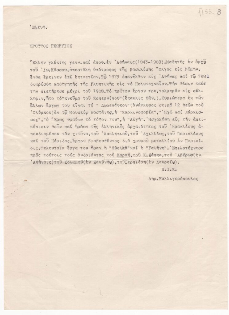 Κείμενο, δακτυλόγραφο, στα ελληνικά, χαρτί, 28,8×21,3 εκ. Αποδελτίωση του λήμματος του Δημ. Καλλογερόπουλου στο Εγκυκλοπαιδικό Λεξικό Ελευθερουδάκη. Περιέχε σύντομα στοιχεία για τις σπουδές του καλλιτέχνη και κατάλογο έργων.