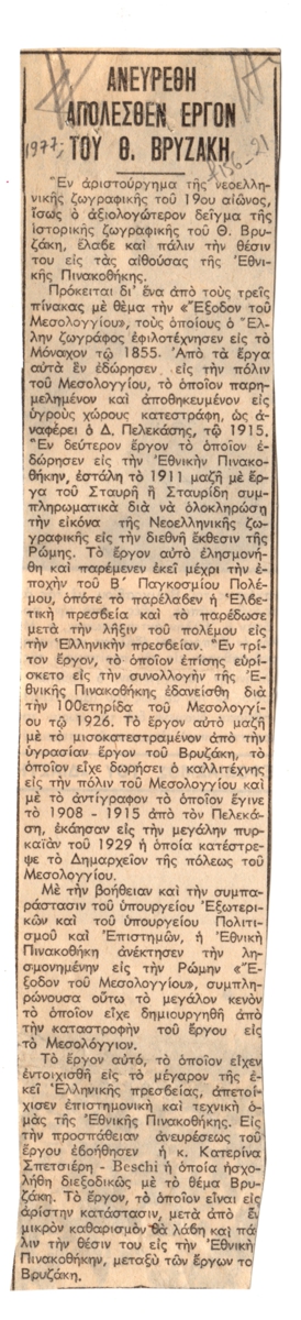 Απόκομμα, χαρτί, 23.5×5 εκ., στα ελληνικά, δημοσίευσης άρθρου το οποίο αναφέρεται στην απόκτηση έργου του Θεόδωρου Βρυζάκη από την Εθνική Πινακοθήκη.
