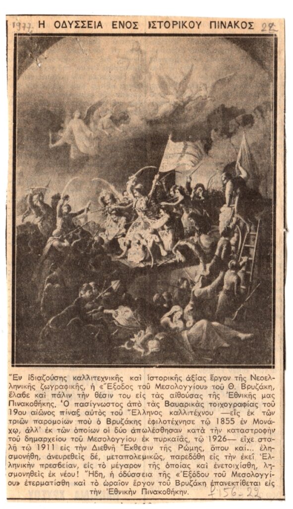 Απόκομμα, χαρτί, 16,5×9,5 εκ., στα ελληνικά,δημοσίευσης άρθρου το οποίο αναφέρεται στην επανέκθεση έργου του Θεόδωρου Βρυζάκη στην Εθνική Πινακοθήκη Αθηνών.