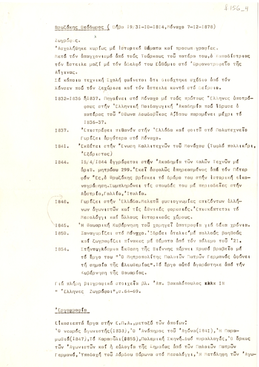 Βιογραφικό, δακτυλόγραφο, χαρτί, 2 φφ, 29,5×21 εκ., του Θεόδωρου Βρυζάκη. Περιέχει σε χρονολογική σειρά προσωπικά στοιχεία, εργογραφία και βιβλιογραφία του καλλιτέχνη. Ειδικότερα, για τον καλλιτέχνη έχουν γράψει οι Στ. Λυδάκης, Montadon, Ζαχ. Παπαντωνίου, Δ. Ευαγγελίδης και Θεμ. Τσάτσος.