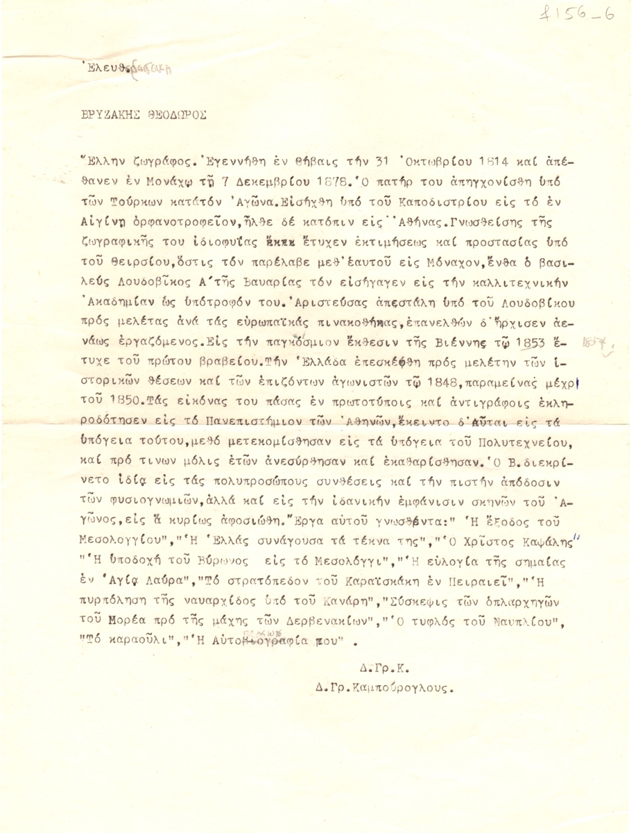 Αποδελτίωση, δακτυλόγραφο, χαρτί, 29×21 εκ., στα ελληνικά, με κείμενο του Δ. Καμπούρογλου, για τον Θεόδωρο Βρυζάκη.