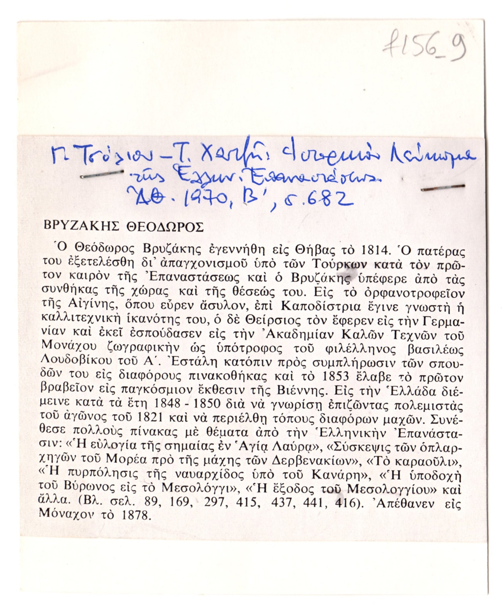 Φωτοαντίγραφο, χαρτί, 8,5×10 εκ., στα ελληνικά, συρραμμένο σε απόκομμα πρόσκλησης εγκαινίων έκθεσης, συνολικών διαστάσεων 12,2×10 εκ., το οποίο φέρει βιογραφικό σημείωμα του Θεόδωρου Βρυζάκη.